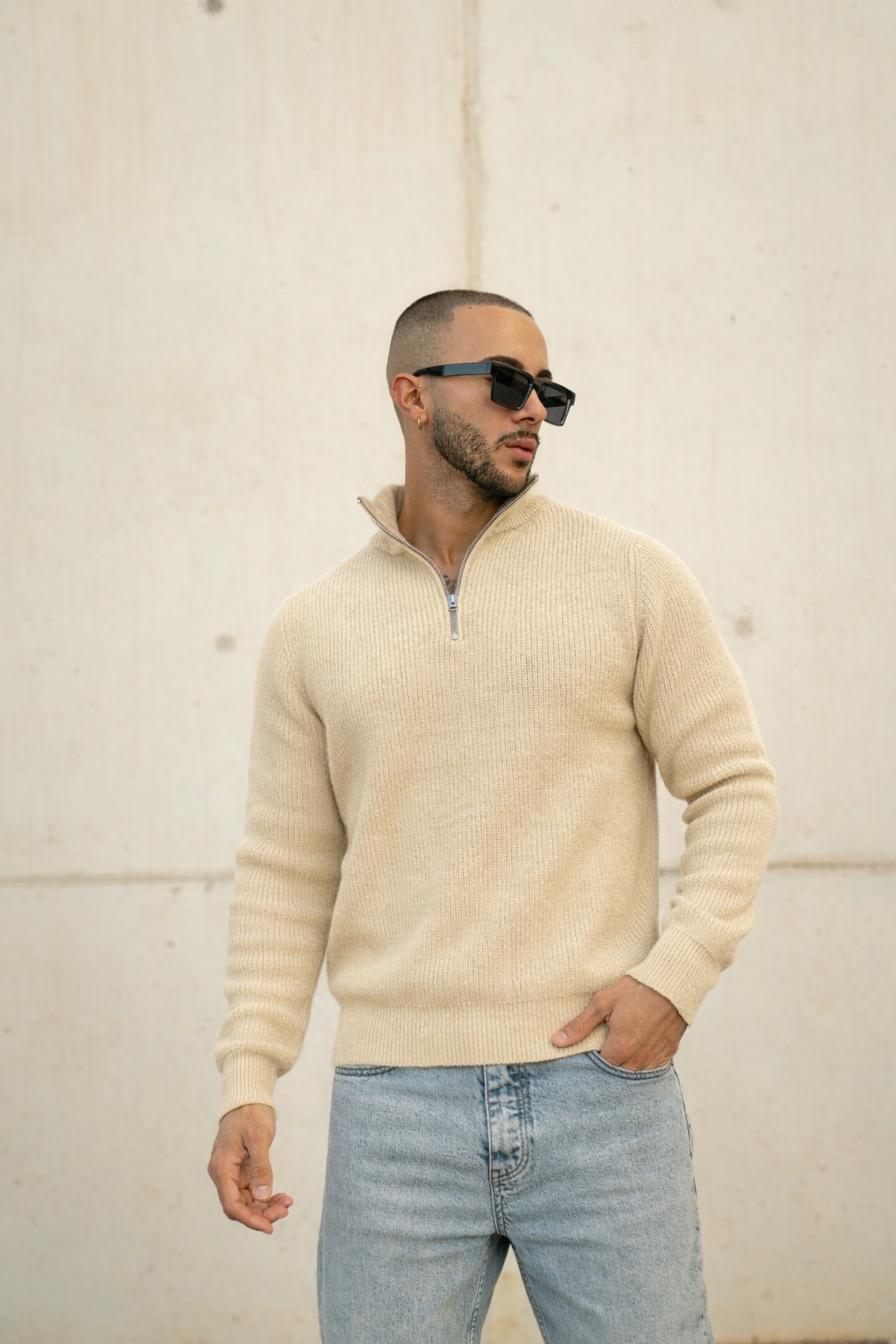 Rib-knit half-zip sweater with a zip closure and a thick, premium feel. The clean collar and the slightly oversized silhouette create a modern, polished look—easy to style from casual to smart.